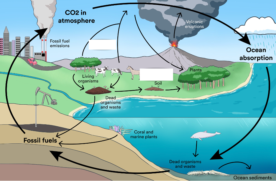 Photosynthetic organisms such as plants use _________________________________to make organic molecules, which travel through food chains. Eventually, the _________________________________is released into the atmosphere through ________________ . Geological processes and human activity also contribute to the _________________ over time.